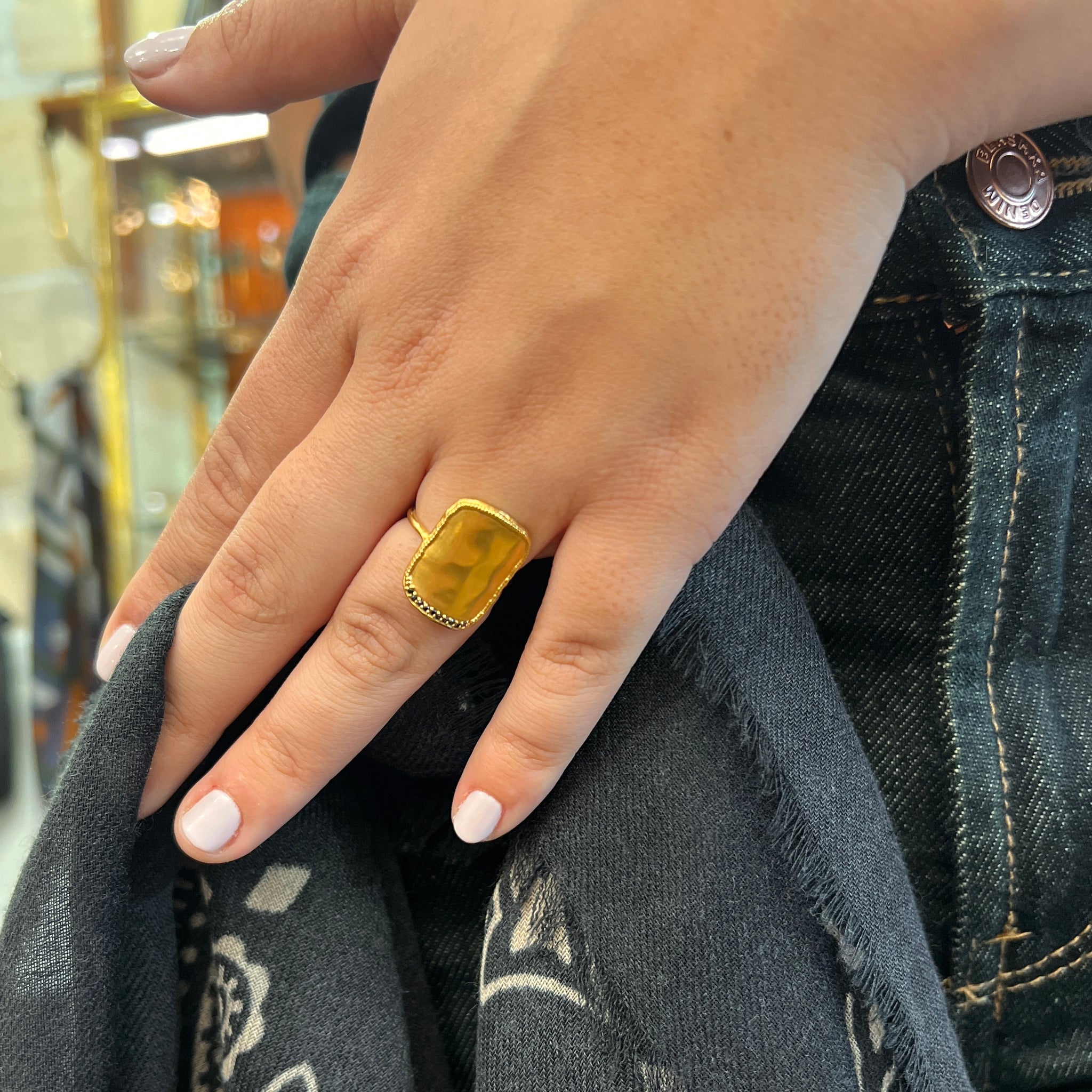 Cette bague se compose d'un anneau fin, et d'une rectangulaire arrondie sur les angles et légèrement martelée en plaqué or 3mc sertie de zircons noirs.