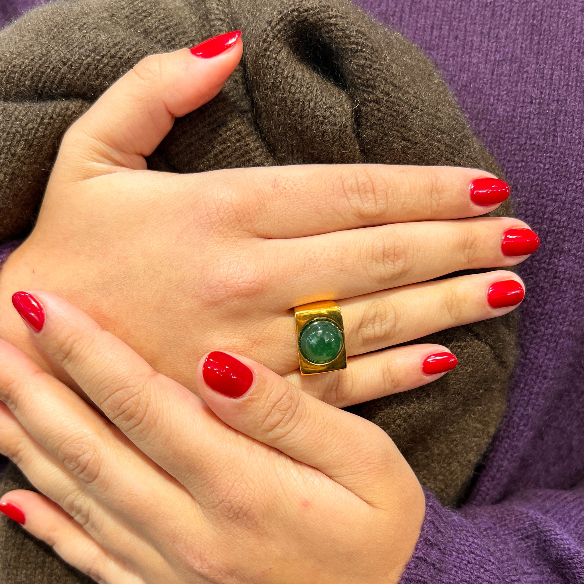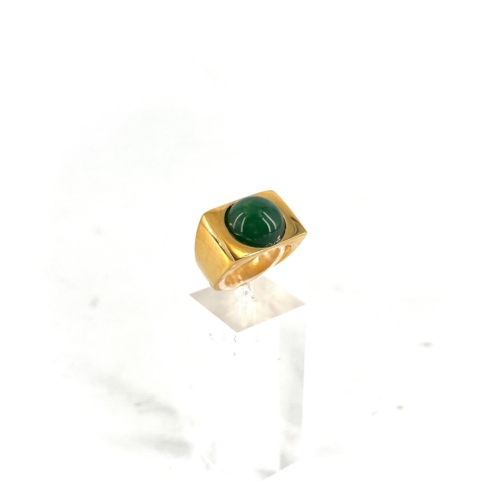 Cette bague, en Plaqué Or, est agrémentée d'un Onyx Vert rond, cabochon.