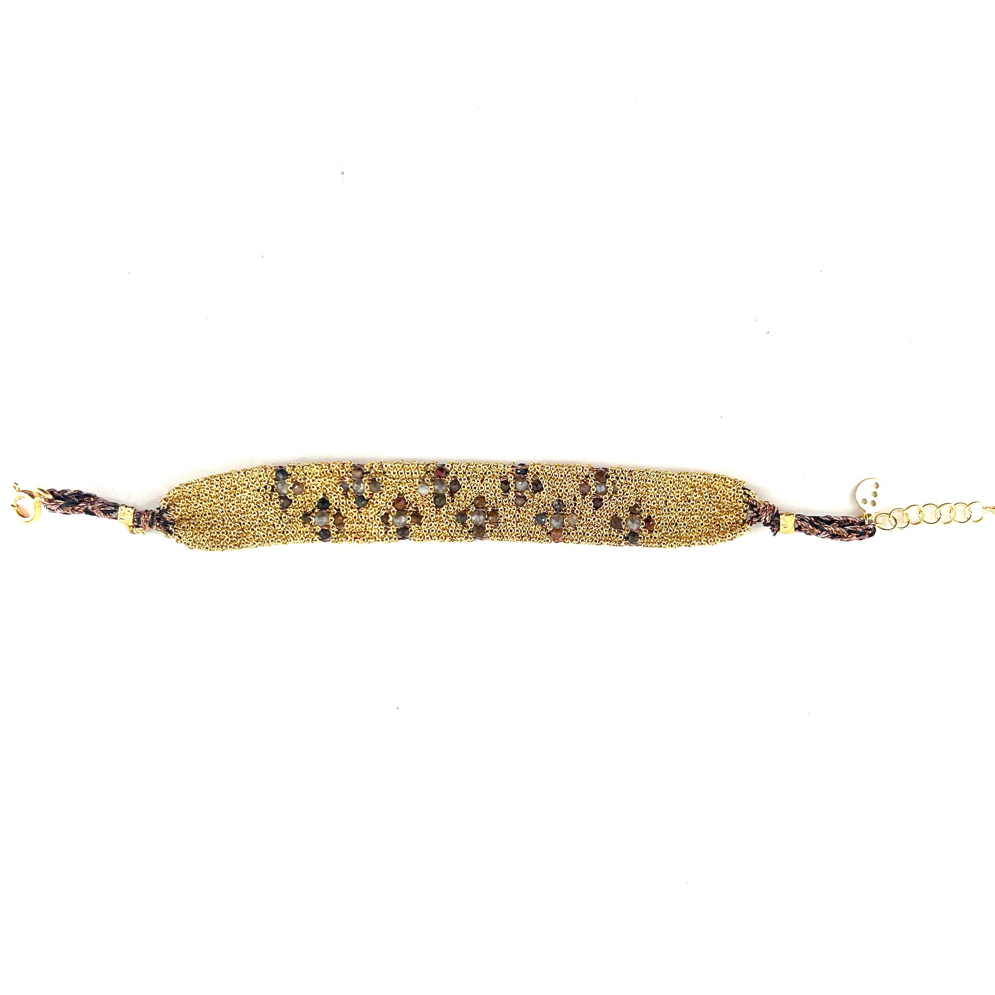 Ce bracelet tissé à la main est composé de chaînes en argent plaquées à l'or fin, et de pierres semi-précieuses.