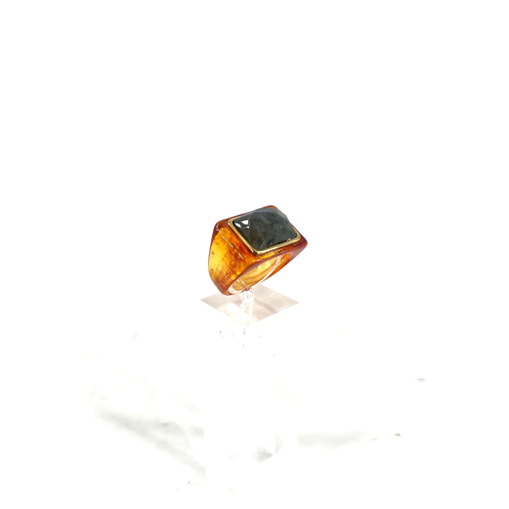Cette bague, en acétate Tortoisee, est agrémentée d'une Labradorite facettée cerclée en plaqué Or.