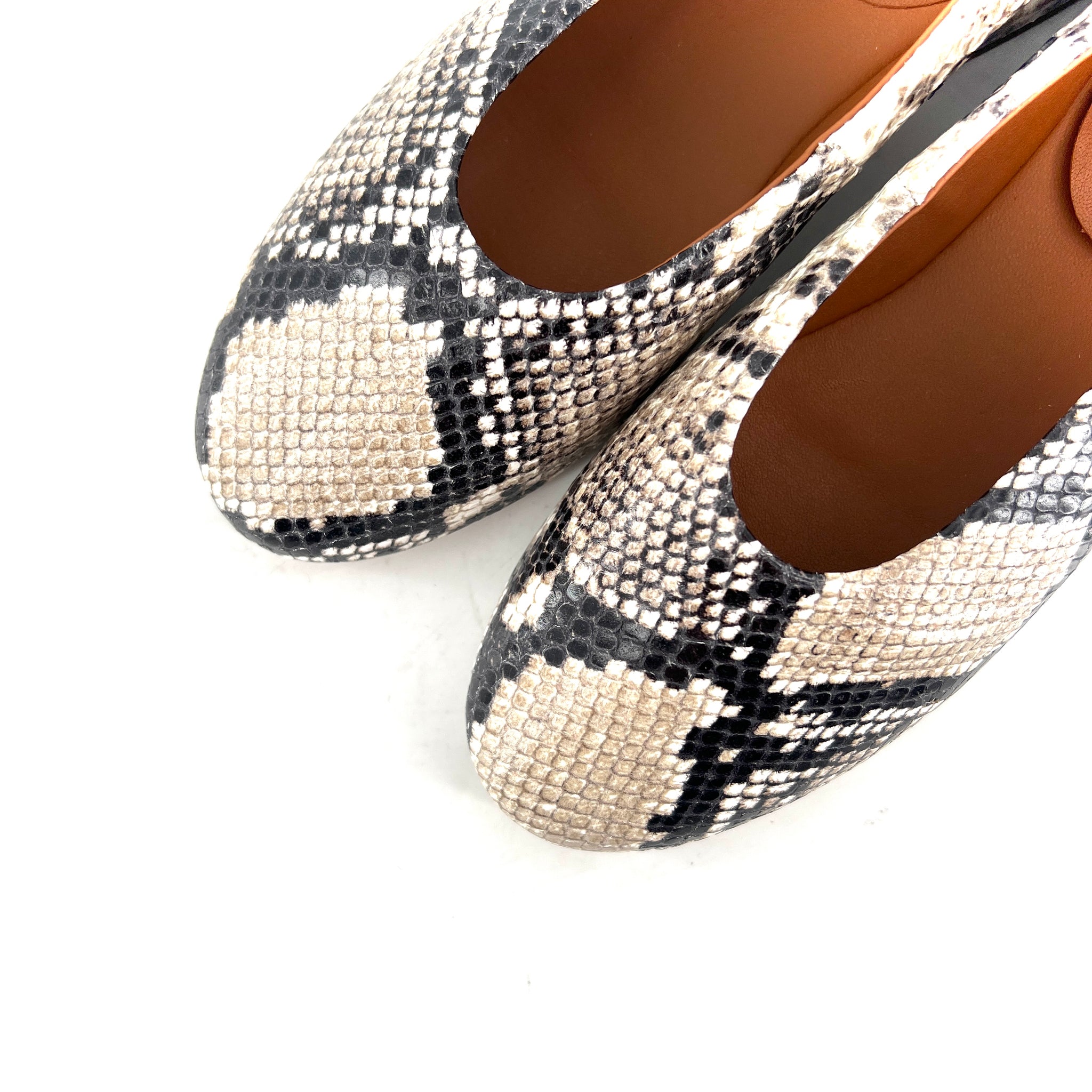 MAISON TOUFET, propose une version de ballerine simplissime, très emboîtante, donc, ultra-chaussante, agrémentée d'un tout petit talon décroché juste parfait.