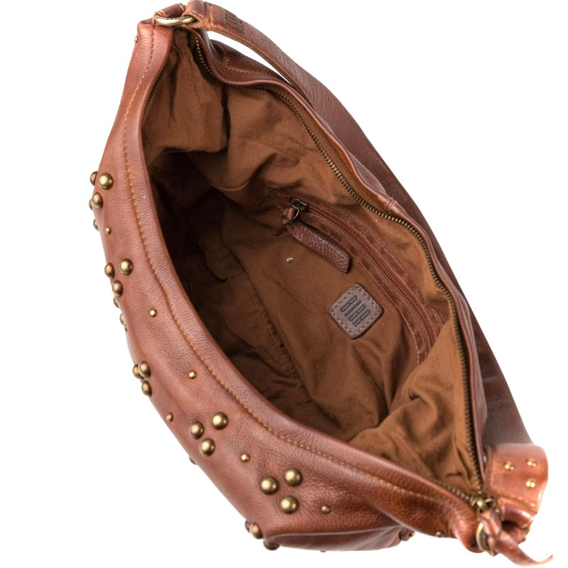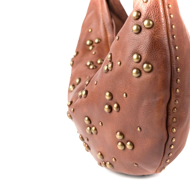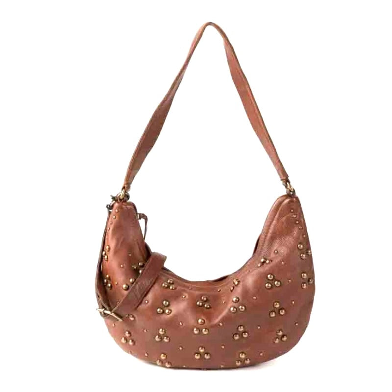 Sac Porté Épaule et Bandoulière Format Banane en Cuir Camel et Clous Vieil Or