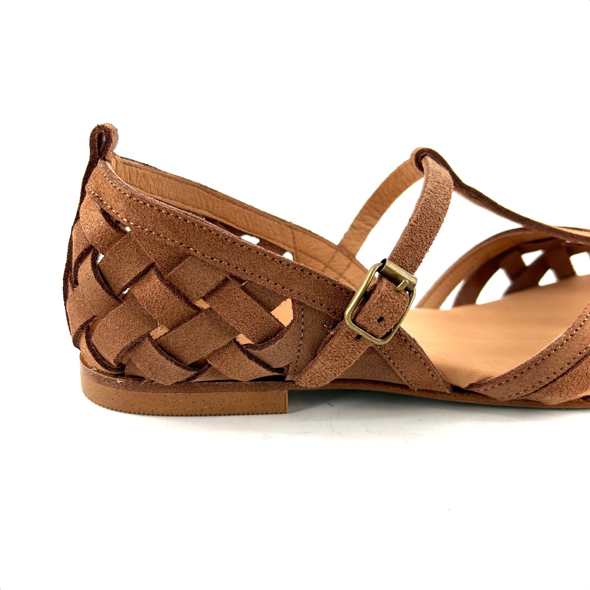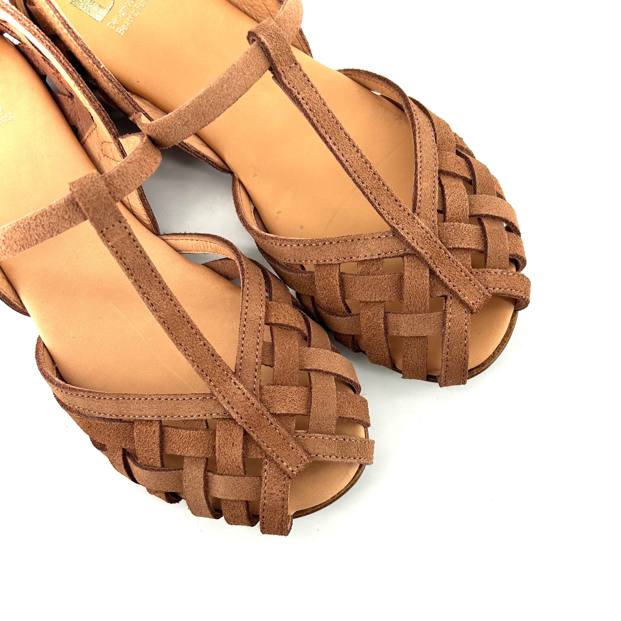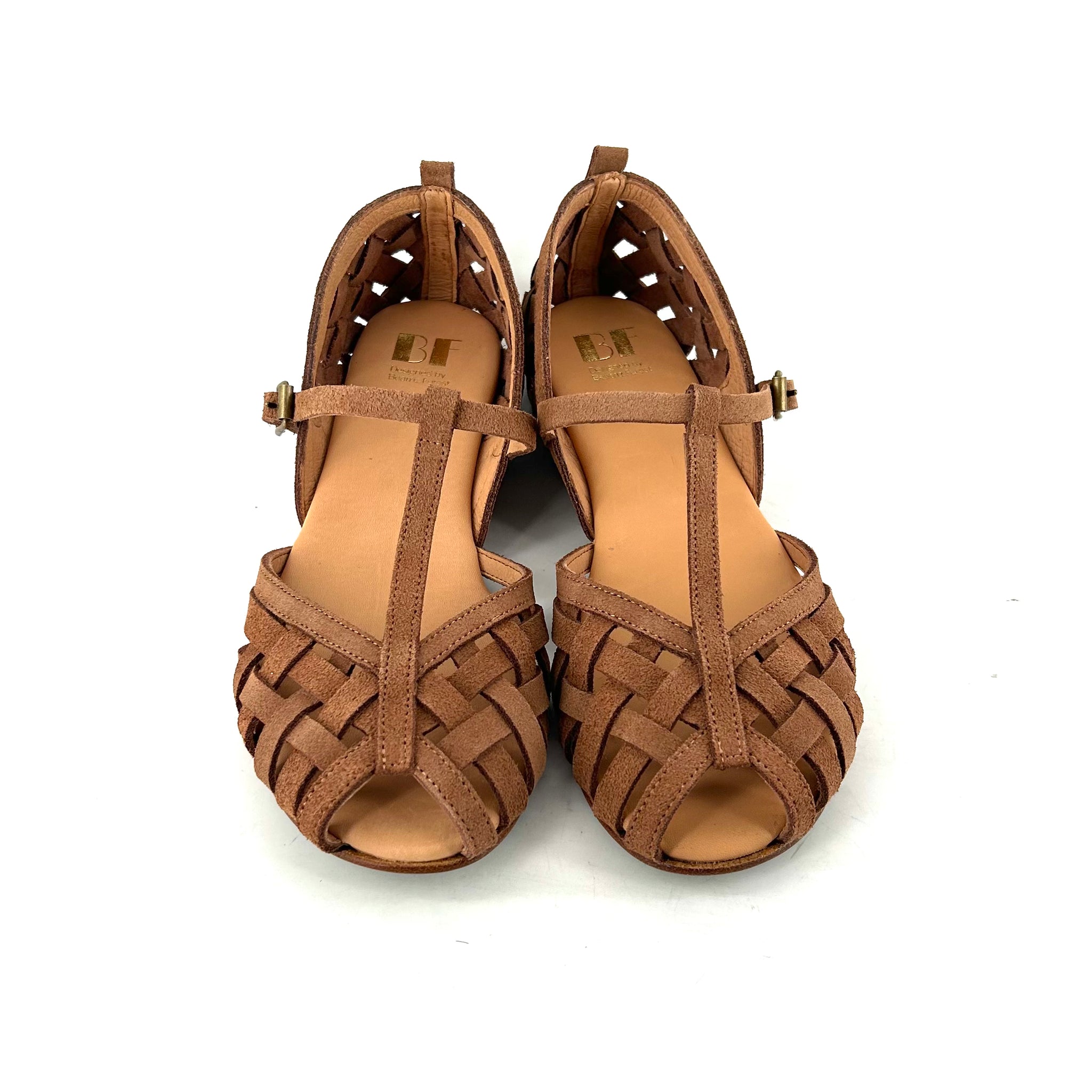 Un montage tressé à l'avant, qui laisse à peine apparaître les orteils, emboîte parfaitement le pied, une lanière "Salomé" assortie d'un empiècement de cuir à l'arrière assure un maintien impeccable.