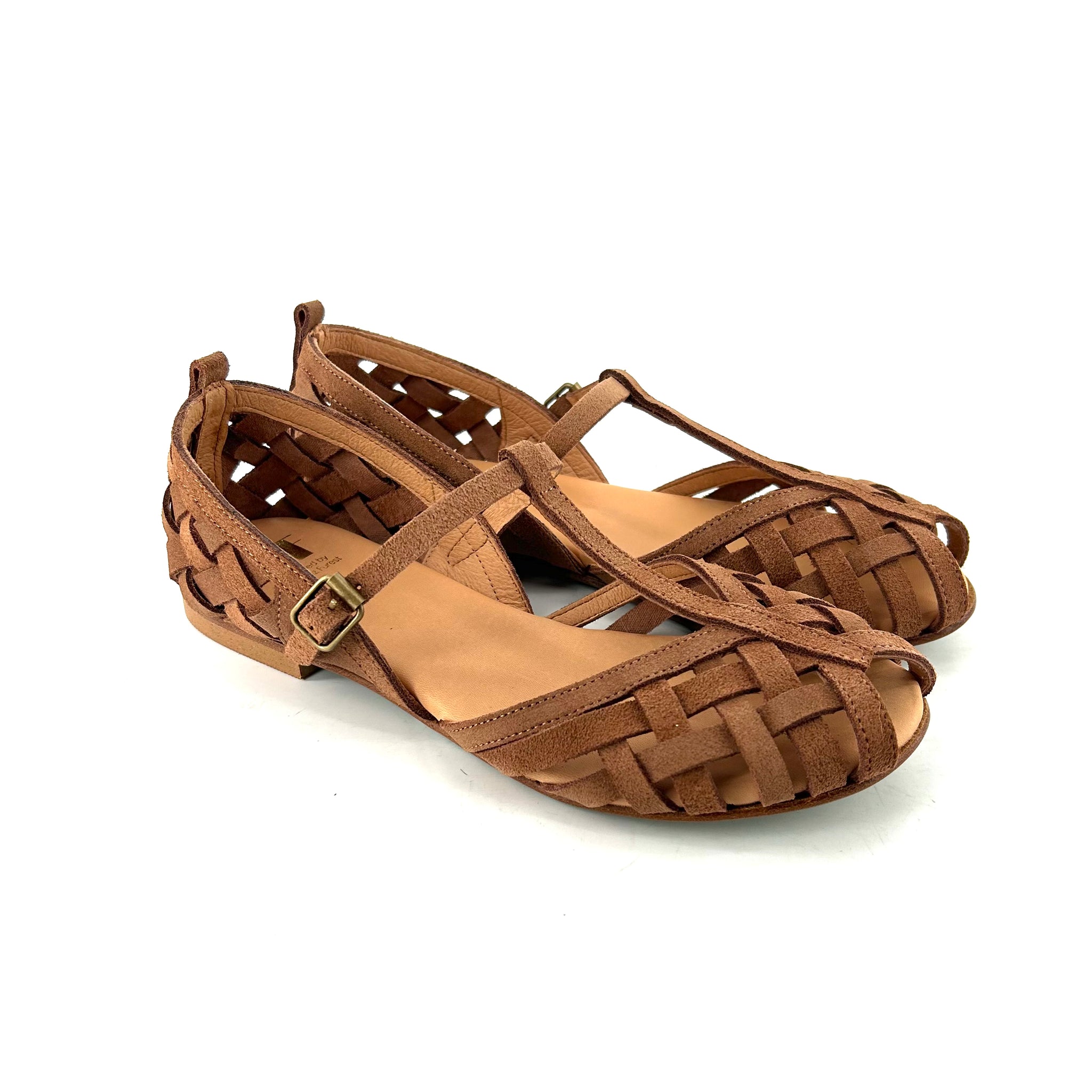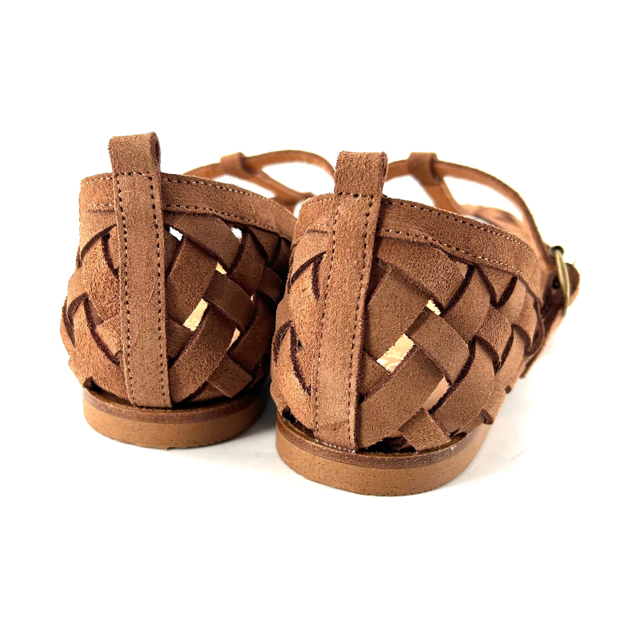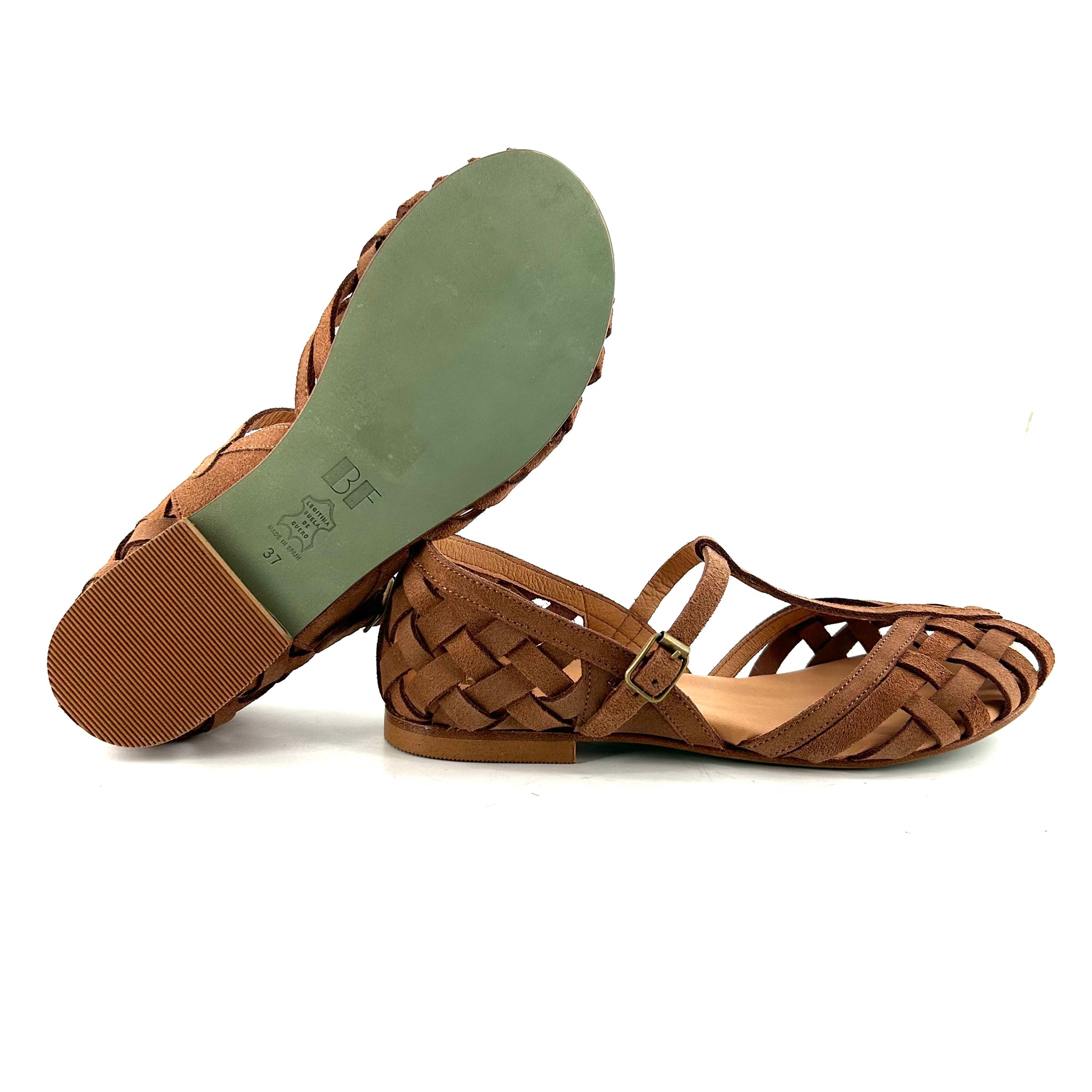 Un montage tressé à l'avant, qui laisse à peine apparaître les orteils, emboîte parfaitement le pied, une lanière "Salomé" assortie d'un empiècement de cuir à l'arrière assure un maintien impeccable.