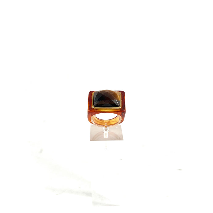 Large Bague en Acétate Tortoise et Oeil de Tigre Facetté Serti Plaqué Or