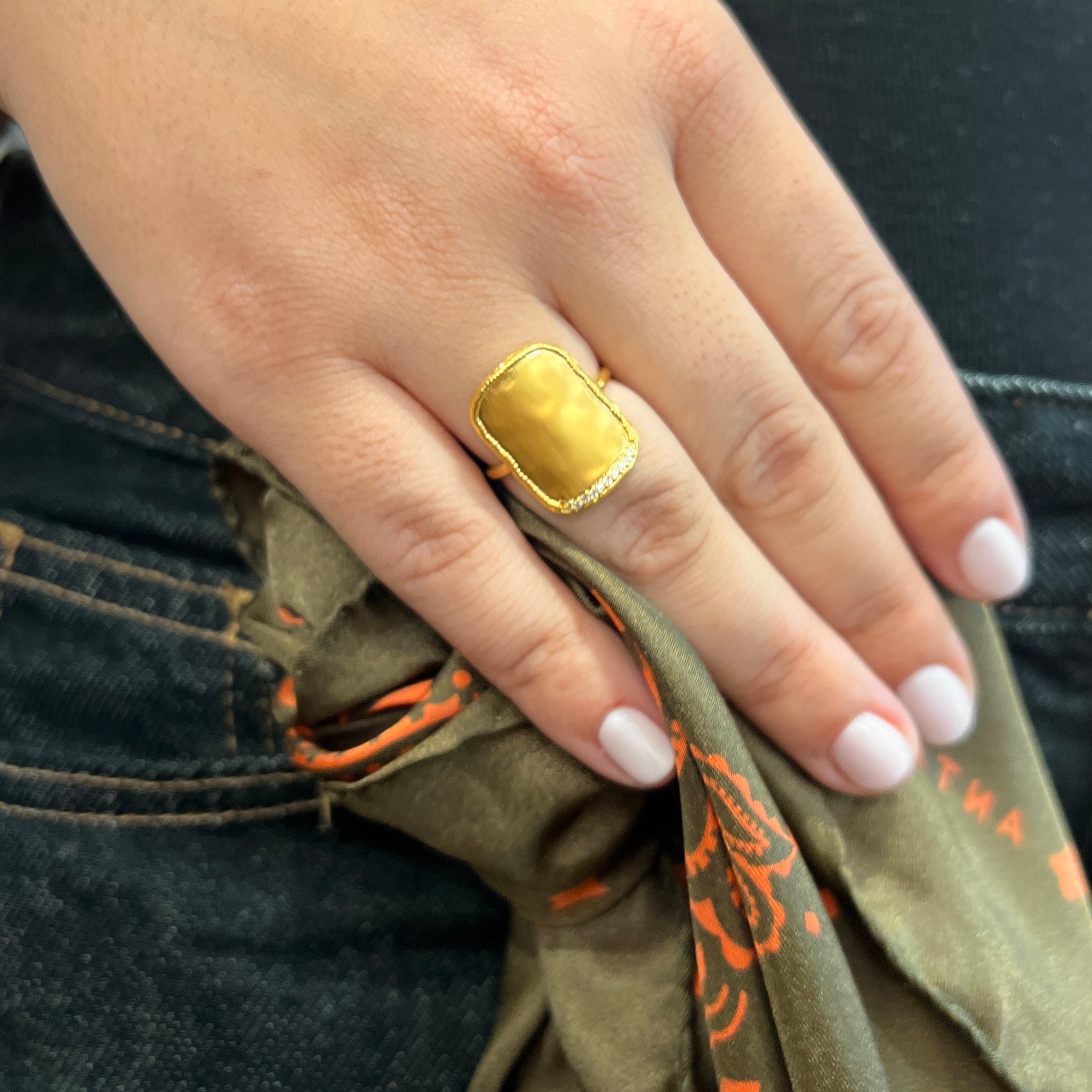Cette bague se compose d'un anneau fin, et d'une rectangulaire arrondie sur les angles et légèrement martelée en plaqué or 3mc sertie de zircons blancs.