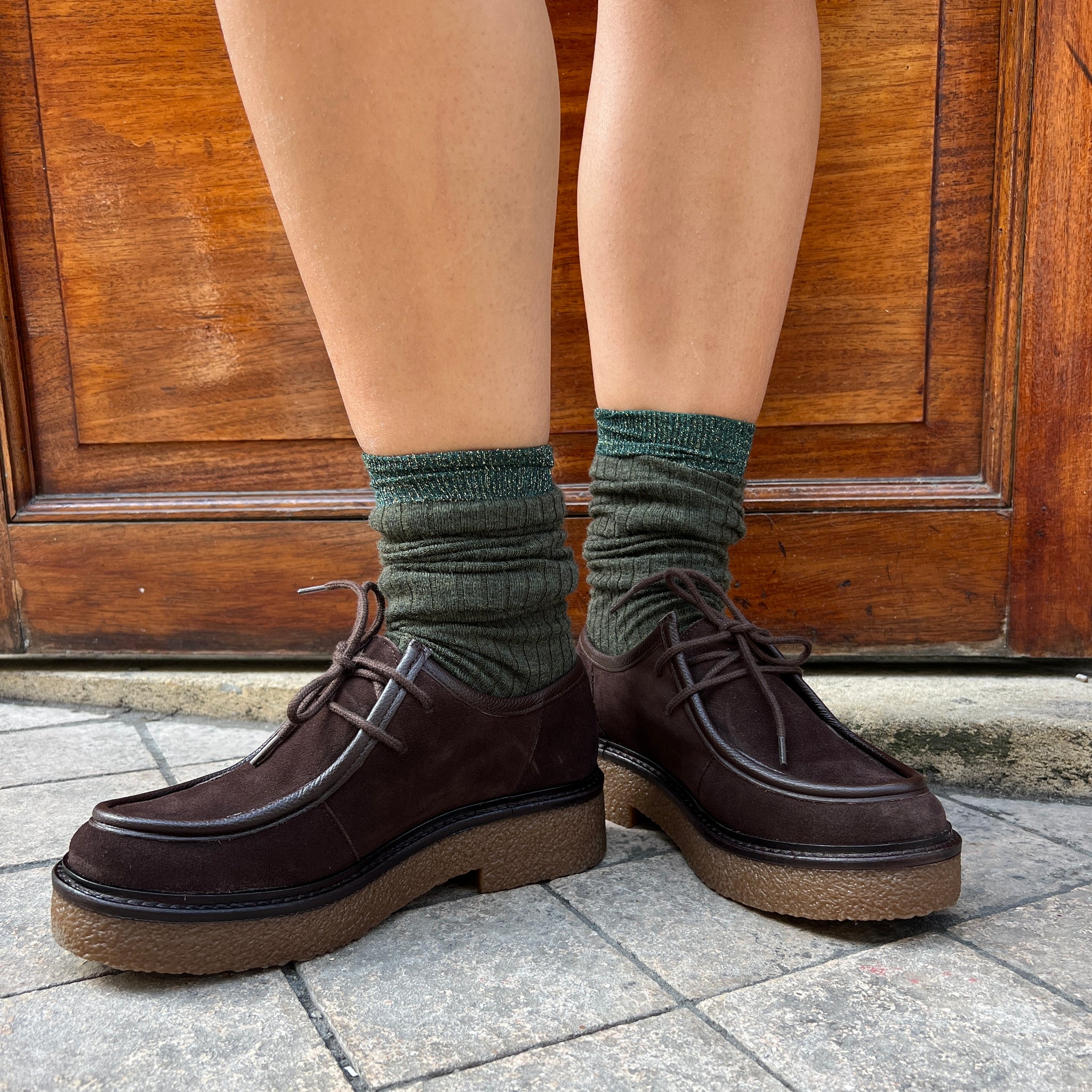 On adore le mélange de matières et de couleurs (semelle en crêpe / trépointe en cuir, daim café/ cuir café).