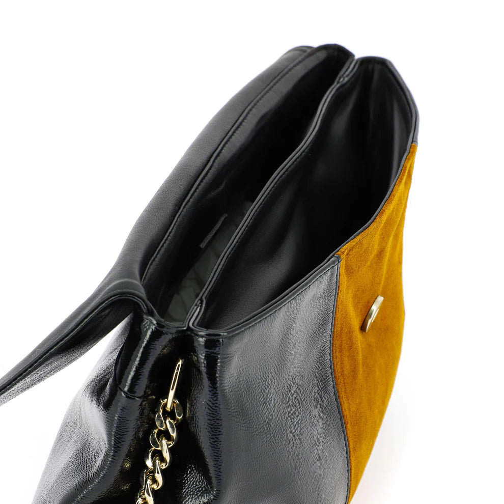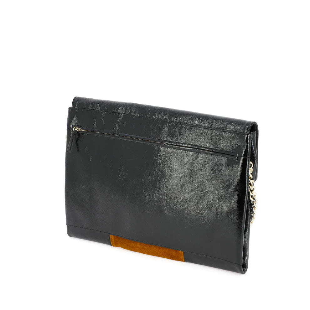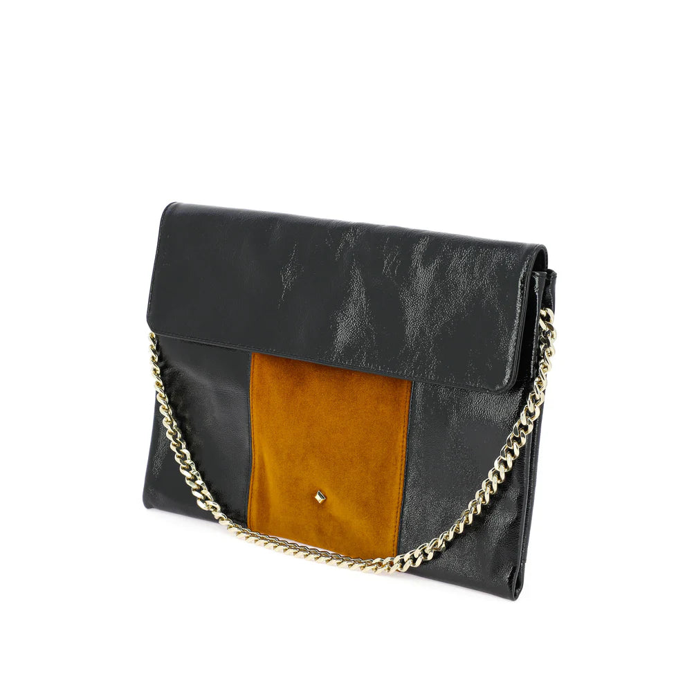 Ce grand sac pochette porté main ou épaule propose une fermeture bouton pression aimantée.